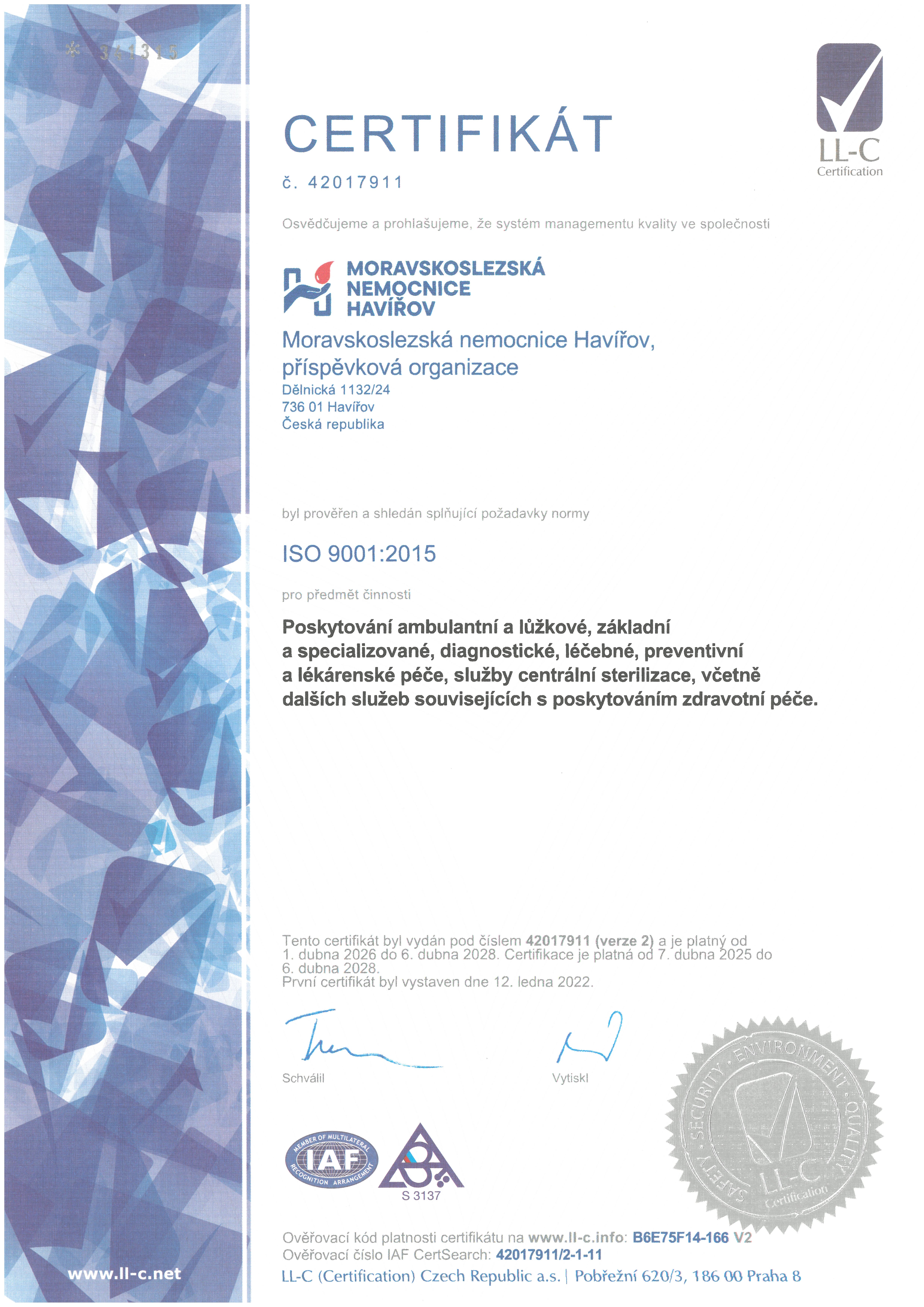 Chceme i nadále budovat efektivní, inteligentní organizaci se stabilizovaným, motivovaným a profesně výkonným týmem zaměstnanců. Moravskoslezská nemocnice Havířov, p.o. má dlouhodobý zájem prokazatelně vykazovat dosahovanou kvalitu služeb v oblasti poskytované zdravotní péče, neustále zvyšovat spokojenost pacientů i zaměstnanců, udržovat a neustále rozvíjet procesní a strategický systém řízení. V březnu letošního roku úspěšně proběhla recertifikace pro řízení kvality ISO 9001:2015.